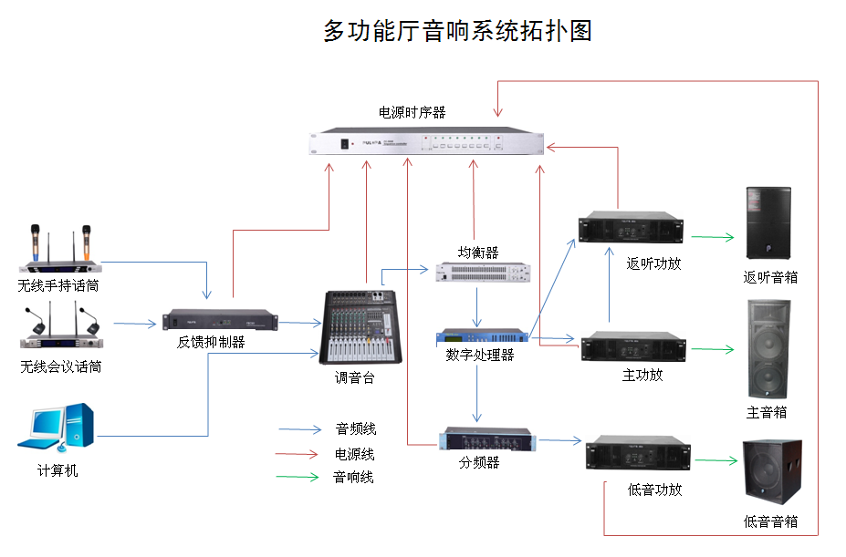4)为满足功能需要,优化厅堂音响系统效果,系统中还配置了图示均衡器、反馈抑制器。